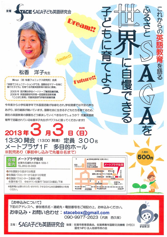 3月3日(日)、佐賀メートプラザにて、mpi会長松香洋子先生の講演会『ふるさとSAGAを世界に自慢できる子どもを育てよう』を開催しました。