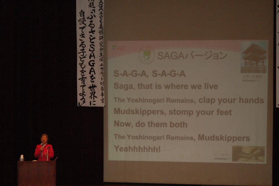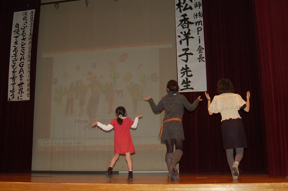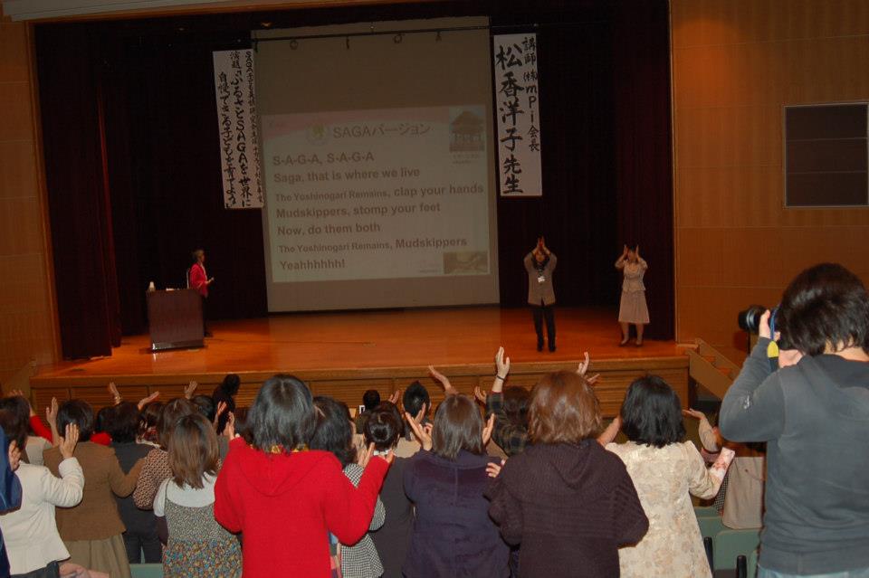 講演会のテーマに基づき、松香先生には佐賀の名物、シシリアンライスや吉野ヶ里を盛り込んだチャンツをお披露目していただきました。また、お越しになった方々には6人のグループを作っていただき、そのチャンツを言いまわしました。お話を聞くだけではなく、一緒に楽しめるとてもアクティヴな講演となりました。